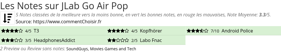 Les notes des sites et magazines internet peuvent etre peut-etre biaisés, au moins avec les avis client et des utilisateurs qui ont acheté JLab Go Air Pop sur amazon ou la fnac, on est sur d'avoir de vrais critiques sur ce produit. (les liens vers les magasins sont sponsorisés).