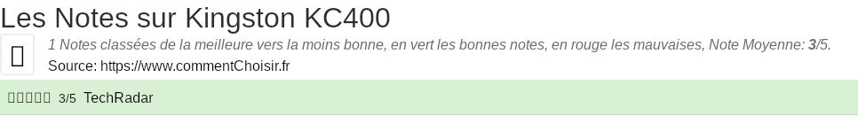 Parmis ces tests des sites & magazines internet spécialisés dans les Disque Dur, 1 ont donné une note et on obtient une note moyenne de 3/5 pour ce produit de Kingston.