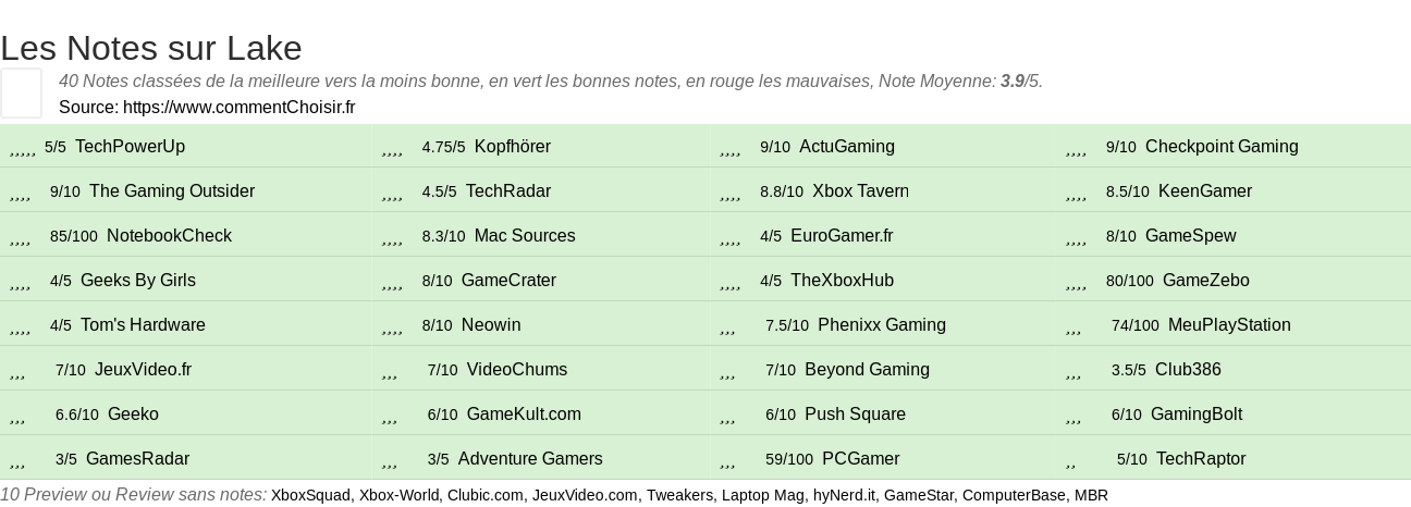 Les notes des sites et magazines internet peuvent etre peut-etre biaisés, au moins avec les avis client et des utilisateurs qui ont acheté Lake sur amazon ou la fnac, on est sur d'avoir de vrais critiques sur ce produit. (les liens vers les magasins sont sponsorisés). Pour les jeux et quand cela est est possible nous listons aussi les notes moyennes sur les plateformes de consommateurs (comme IGDB)
