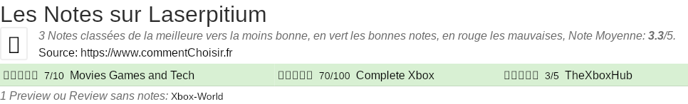 Parmis ces tests des sites & magazines internet spécialisés dans les Jeux, 3 ont donné une note et on obtient une note moyenne de 3.3/5 pour ce produit de Laserpitium.