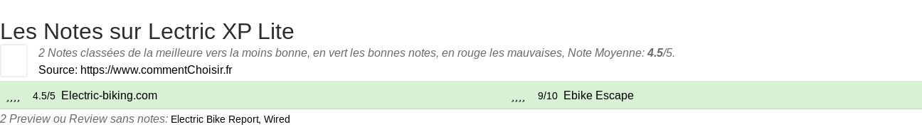 Parmis ces tests des sites & magazines internet spécialisés dans les Vélos et trotinettes, 2 ont donné une note et on obtient une note moyenne de 4.3/5 pour ce produit de Lectric.