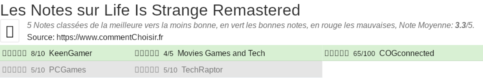 Parmis ces tests des sites & magazines internet spécialisés dans les Jeux, 5 ont donné une note et on obtient une note moyenne de 3.3/5 pour ce produit de Life Is Strange.