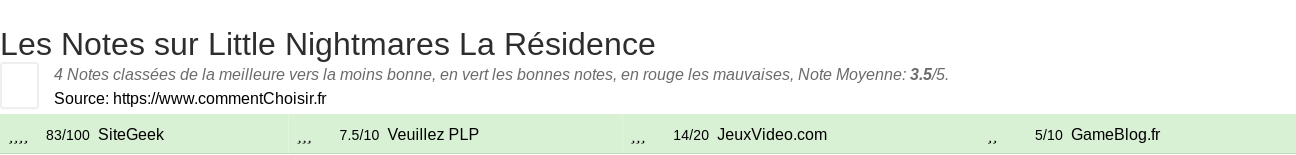 Les notes des sites et magazines internet peuvent etre peut-etre biaisés, au moins avec les avis client et des utilisateurs qui ont acheté Little Nightmares La Résidence sur amazon ou la fnac, on est sur d'avoir de vrais critiques sur ce produit. (les liens vers les magasins sont sponsorisés). Pour les jeux et quand cela est est possible nous listons aussi les notes moyennes sur les plateformes de consommateurs (comme IGDB)