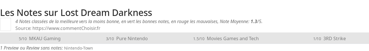 Parmis ces tests des sites & magazines internet spécialisés dans les Jeux, 4 ont donné une note et on obtient une note moyenne de 1.3/5 pour ce produit de Lost Dream.