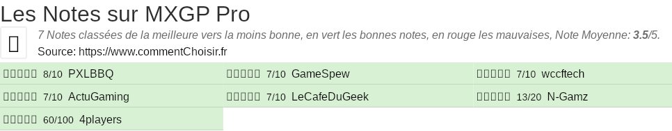 Parmis ces tests des sites & magazines internet spécialisés dans les Jeux, 7 ont donné une note et on obtient une note moyenne de 3.5/5 pour ce produit de MXGP.