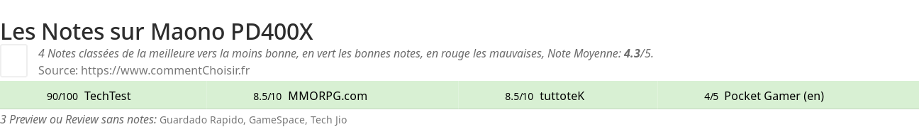 Les notes des sites et magazines internet peuvent etre peut-etre biaisés, au moins avec les avis client et des utilisateurs qui ont acheté Maono PD400X sur amazon ou la fnac, on est sur d'avoir de vrais critiques sur ce produit. (les liens vers les magasins sont sponsorisés). Pour les jeux et quand cela est est possible nous listons aussi les notes moyennes sur les plateformes de consommateurs (comme IGDB)