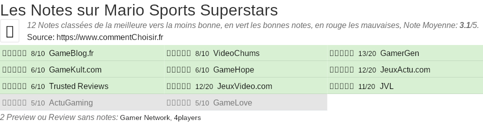 Parmis ces tests des sites & magazines internet spécialisés dans les Jeux, 12 ont donné une note et on obtient une note moyenne de 3.1/5 pour ce produit de Mario.