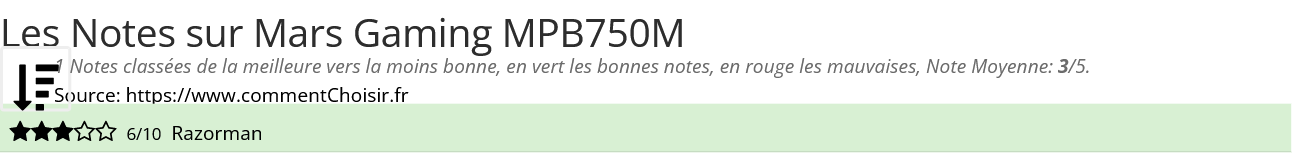 Parmis ces tests des sites & magazines internet spécialisés dans les , 1 ont donné une note et on obtient une note moyenne de 3/5 pour ce produit de Mars Gaming.