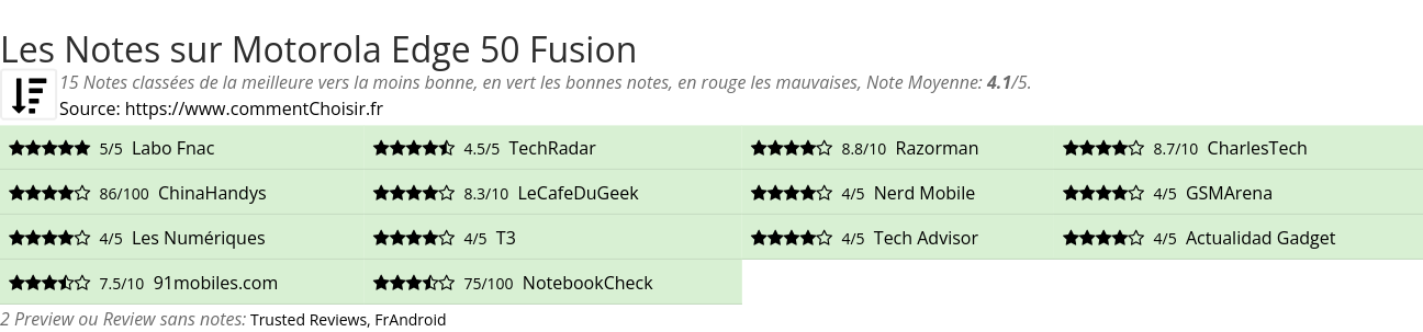 Les notes des sites et magazines internet peuvent etre peut-etre biaisés, au moins avec les avis client et des utilisateurs qui ont acheté Motorola Edge 50 Fusion sur amazon ou la fnac, on est sur d'avoir de vrais critiques sur ce produit. (les liens vers les magasins sont sponsorisés).
