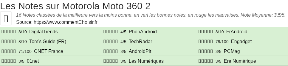 Parmis ces tests des sites & magazines internet spécialisés dans les Montres Connectées, 16 ont donné une note et on obtient une note moyenne de 3.5/5 pour ce produit de Motorola.
