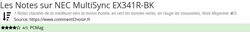 Les notes des sites et magazines internet peuvent etre peut-etre biaisés, au moins avec les avis client et des utilisateurs qui ont acheté NEC MultiSync EX341R-BK sur amazon ou la fnac, on est sur d'avoir de vrais critiques sur ce produit. (les liens vers les magasins sont sponsorisés).