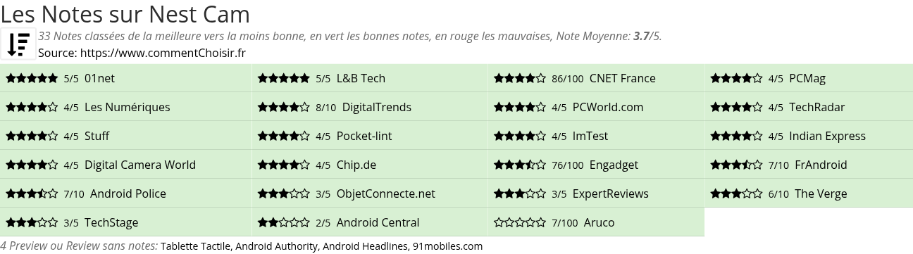 Parmis ces tests des sites & magazines internet spécialisés dans les Domotique, 34 ont donné une note et on obtient une note moyenne de 3.7/5 pour ce produit de Nest.