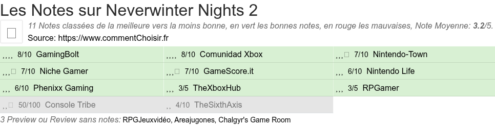 Pour mieux comparer, nous avons cherché pour vous les avantages et inconvénients de Neverwinter Nights 2 et les notes données par les sites spécialisés.