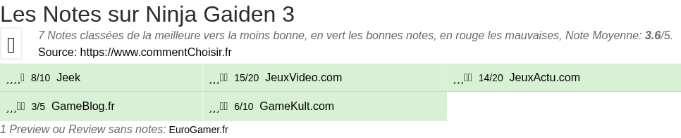 Les notes des sites et magazines internet peuvent etre peut-etre biaisés, au moins avec les avis client et des utilisateurs qui ont acheté Ninja Gaiden 3 sur amazon ou la fnac, on est sur d'avoir de vrais critiques sur ce produit. (les liens vers les magasins sont sponsorisés). Pour les jeux et quand cela est est possible nous listons aussi les notes moyennes sur les plateformes de consommateurs (comme IGDB)