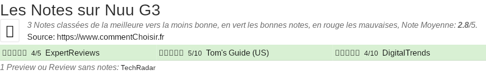 Les notes des sites et magazines internet peuvent etre peut-etre biaisés, au moins avec les avis client et des utilisateurs qui ont acheté Nuu G3 sur amazon ou la fnac, on est sur d'avoir de vrais critiques sur ce produit. (les liens vers les magasins sont sponsorisés).