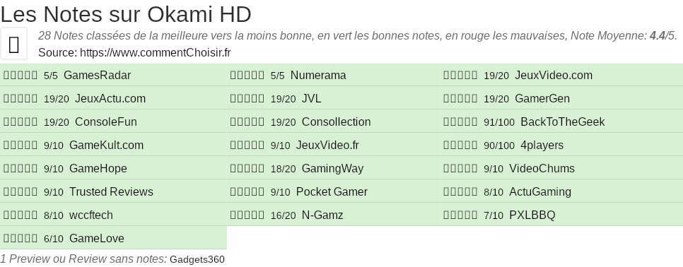 Parmis ces tests des sites & magazines internet spécialisés dans les Jeux, 28 ont donné une note et on obtient une note moyenne de 4.4/5 pour ce produit de Okami HD.