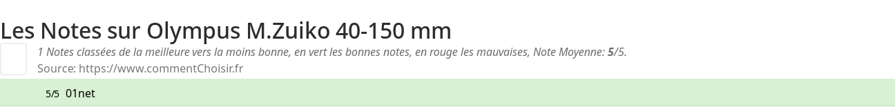 Parmis ces tests des sites & magazines internet spécialisés dans les Objectifs Photo, 1 ont donné une note et on obtient une note moyenne de 5/5 pour ce produit de Olympus.