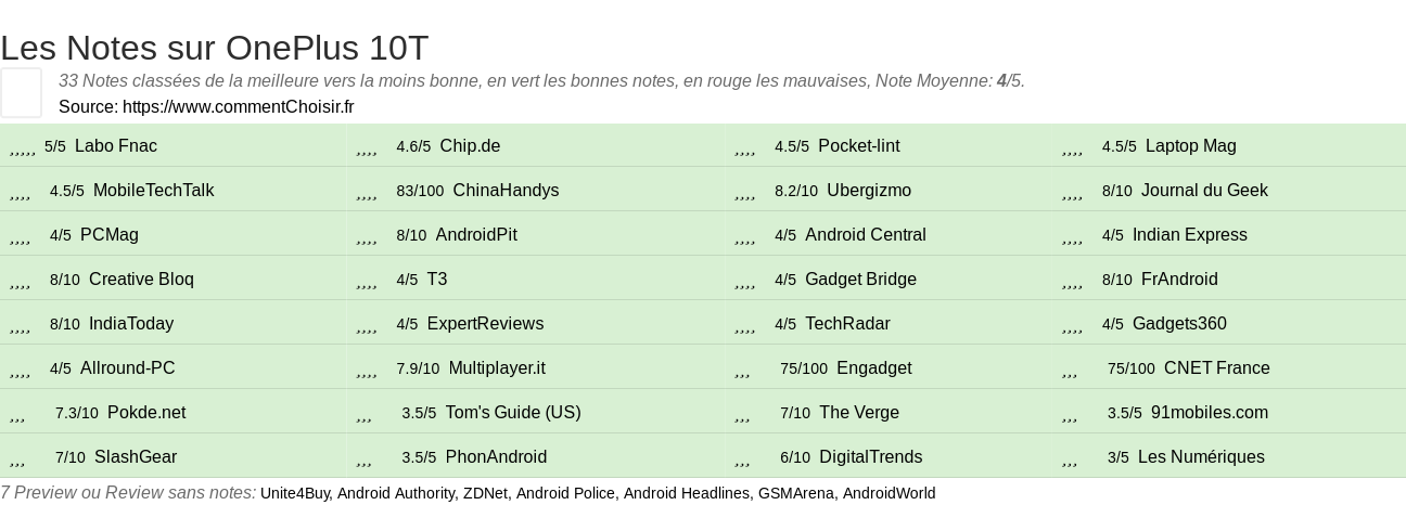| 5/5 Labo Fnac | 83/100 ChinaHandys | 8/10 Journal du Geek |