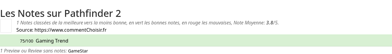 Parmis ces tests des sites & magazines internet spécialisés dans les Jeux, 1 ont donné une note et on obtient une note moyenne de 3.8/5 pour ce produit de Pathfinder.