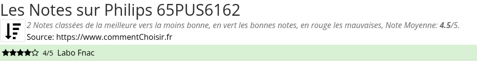 Les notes des sites et magazines internet peuvent etre peut-etre biaisés, au moins avec les avis client et des utilisateurs qui ont acheté Philips 65PUS6162 sur amazon ou la fnac, on est sur d'avoir de vrais critiques sur ce produit. (les liens vers les magasins sont sponsorisés).