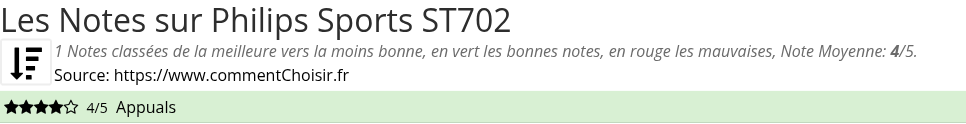 Pour mieux comparer, nous avons cherché pour vous les avantages et inconvénients de Philips Sports ST702 et les notes données par les sites spécialisés.