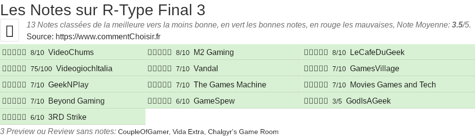 Parmis ces tests des sites & magazines internet spécialisés dans les Jeux, 13 ont donné une note et on obtient une note moyenne de 3.5/5 pour ce produit de R-Type.