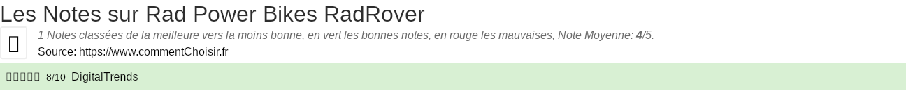 Parmis ces tests des sites & magazines internet spécialisés dans les Vélos et trotinettes, 1 ont donné une note et on obtient une note moyenne de 4/5 pour ce produit de Rad Power Bikes.