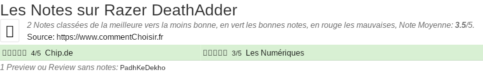 Les notes des sites et magazines internet peuvent etre peut-etre biaisés, au moins avec les avis client et des utilisateurs qui ont acheté Razer DeathAdder sur amazon ou la fnac, on est sur d'avoir de vrais critiques sur ce produit. (les liens vers les magasins sont sponsorisés).