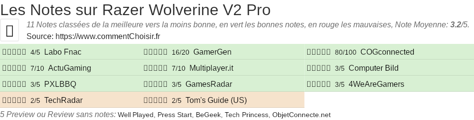 Les notes des sites et magazines internet peuvent etre peut-etre biaisés, au moins avec les avis client et des utilisateurs qui ont acheté Razer Wolverine V2 Pro sur amazon ou la fnac, on est sur d'avoir de vrais critiques sur ce produit. (les liens vers les magasins sont sponsorisés).