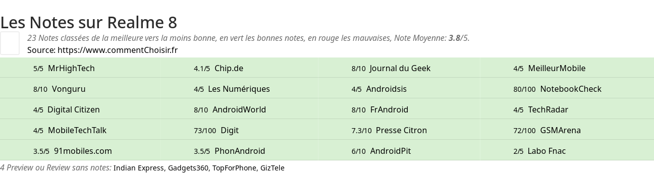 Parmis ces tests des sites & magazines internet spécialisés dans les Téléphone portable, 23 ont donné une note et on obtient une note moyenne de 3.8/5 pour ce produit de Realme.