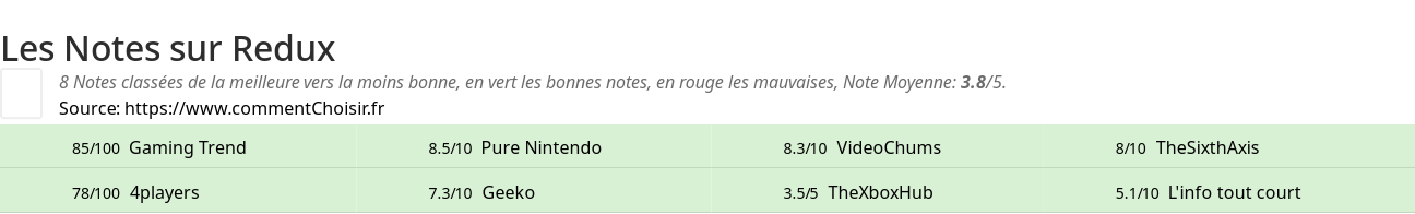Voici tous les 9 avis et les tests que nous avons trouvé sur le Jeux Redux avec les 8 notes et les commentaires des testeurs dans leur review.