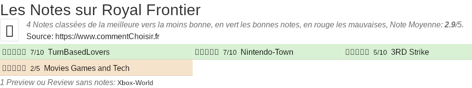 Voici tous les 5 avis et les tests que nous avons trouvé sur le Jeux Royal Frontier avec les 4 notes et les commentaires des testeurs dans leur review.