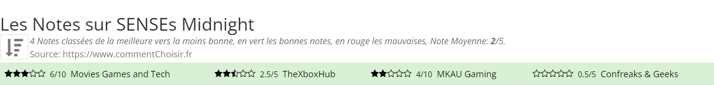 Les notes des sites et magazines internet peuvent etre peut-etre biaisés, au moins avec les avis client et des utilisateurs qui ont acheté SENSEs Midnight sur amazon ou la fnac, on est sur d'avoir de vrais critiques sur ce produit. (les liens vers les magasins sont sponsorisés). Pour les jeux et quand cela est est possible nous listons aussi les notes moyennes sur les plateformes de consommateurs (comme IGDB)