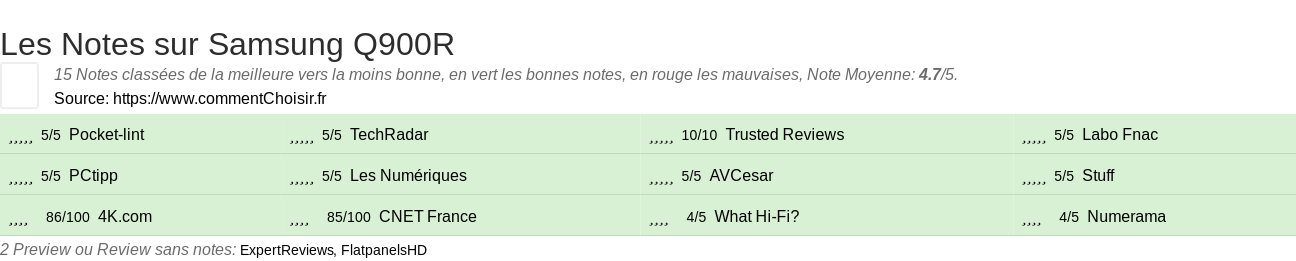 Les notes des sites et magazines internet peuvent etre peut-etre biaisés, au moins avec les avis client et des utilisateurs qui ont acheté Samsung Q900R sur amazon ou la fnac, on est sur d'avoir de vrais critiques sur ce produit. (les liens vers les magasins sont sponsorisés).