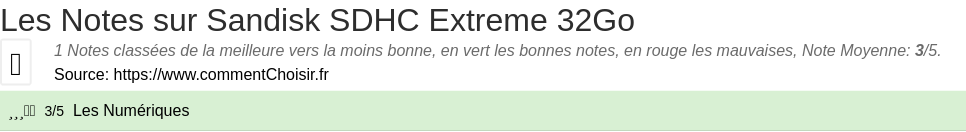 Parmis ces tests des sites & magazines internet spécialisés dans les Carte mémoire, 1 ont donné une note et on obtient une note moyenne de 3/5 pour ce produit de Sandisk.