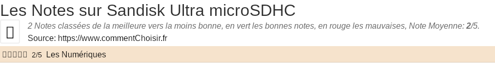 Parmis ces tests des sites & magazines internet spécialisés dans les Carte mémoire, 2 ont donné une note et on obtient une note moyenne de 2/5 pour ce produit de Sandisk.