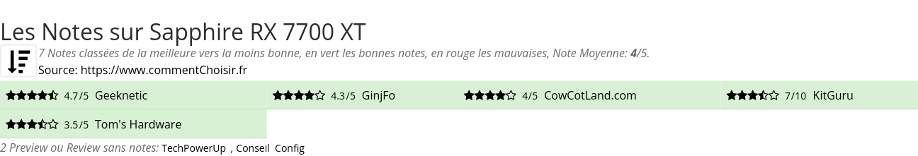 Les notes des sites et magazines internet peuvent etre peut-etre biaisés, au moins avec les avis client et des utilisateurs qui ont acheté Sapphire RX 7700 XT sur amazon ou la fnac, on est sur d'avoir de vrais critiques sur ce produit. (les liens vers les magasins sont sponsorisés).
