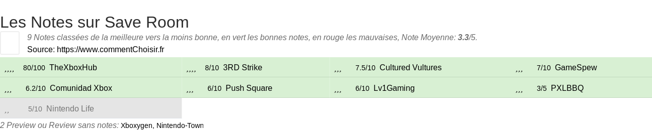 Voici tous les 12 avis et les tests que nous avons trouvé sur le Jeux Save Room avec les 10 notes et les commentaires des testeurs dans leur review.