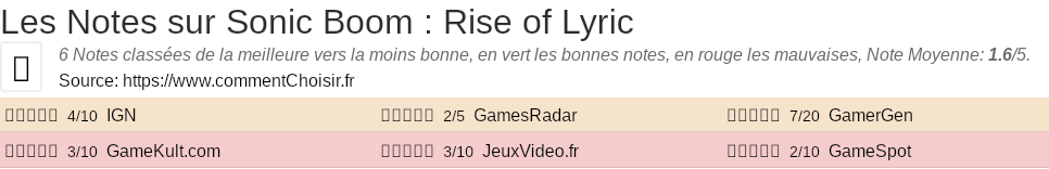 Les notes des sites et magazines internet peuvent etre peut-etre biaisés, au moins avec les avis client et des utilisateurs qui ont acheté Sonic Boom : Rise of Lyric sur amazon ou la fnac, on est sur d'avoir de vrais critiques sur ce produit. (les liens vers les magasins sont sponsorisés). Pour les jeux et quand cela est est possible nous listons aussi les notes moyennes sur les plateformes de consommateurs (comme IGDB) L'EAN du produit testé, son code barre, est le 5050013376291.