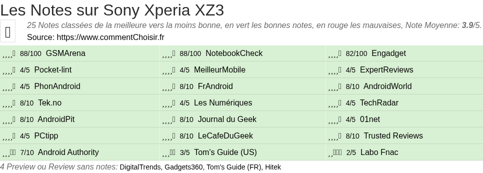 Les notes des sites et magazines internet peuvent etre peut-etre biaisés, au moins avec les avis client et des utilisateurs qui ont acheté Sony Xperia XZ3 sur amazon ou la fnac, on est sur d'avoir de vrais critiques sur ce produit. (les liens vers les magasins sont sponsorisés).
