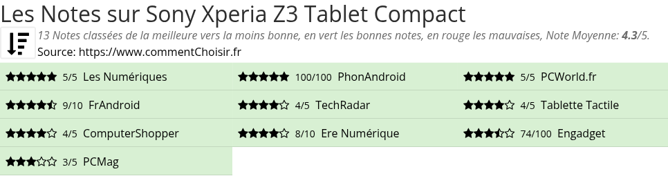 Les notes des sites et magazines internet peuvent etre peut-etre biaisés, au moins avec les avis client et des utilisateurs qui ont acheté Sony Xperia Z3 Tablet Compact sur amazon ou la fnac, on est sur d'avoir de vrais critiques sur ce produit. (les liens vers les magasins sont sponsorisés).