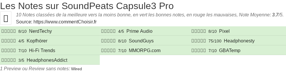 Les notes des sites et magazines internet peuvent etre peut-etre biaisés, au moins avec les avis client et des utilisateurs qui ont acheté SoundPeats Capsule3 Pro sur amazon ou la fnac, on est sur d'avoir de vrais critiques sur ce produit. (les liens vers les magasins sont sponsorisés).