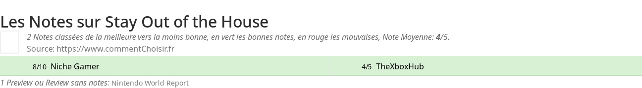 Parmis ces tests des sites & magazines internet spécialisés dans les Jeux, 2 ont donné une note et on obtient une note moyenne de 4/5 pour ce produit de Stay Out of the House.