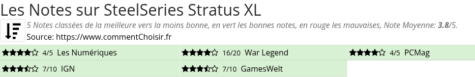 Les notes des sites et magazines internet peuvent etre peut-etre biaisés, au moins avec les avis client et des utilisateurs qui ont acheté SteelSeries Stratus XL sur amazon ou la fnac, on est sur d'avoir de vrais critiques sur ce produit. (les liens vers les magasins sont sponsorisés). Pour les jeux et quand cela est est possible nous listons aussi les notes moyennes sur les plateformes de consommateurs (comme IGDB) L'EAN du produit testé, son code barre, est le 0683193020286.