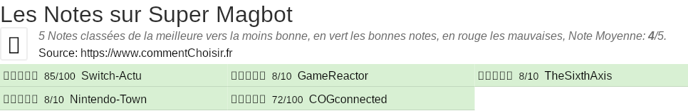 Parmis ces tests des sites & magazines internet spécialisés dans les Jeux, 5 ont donné une note et on obtient une note moyenne de 4/5 pour ce produit de Super Magbot.