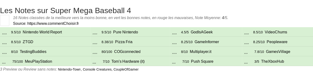 Les notes des sites et magazines internet peuvent etre peut-etre biaisés, au moins avec les avis client et des utilisateurs qui ont acheté Super Mega Baseball 4 sur amazon ou la fnac, on est sur d'avoir de vrais critiques sur ce produit. (les liens vers les magasins sont sponsorisés). Pour les jeux et quand cela est est possible nous listons aussi les notes moyennes sur les plateformes de consommateurs (comme IGDB)