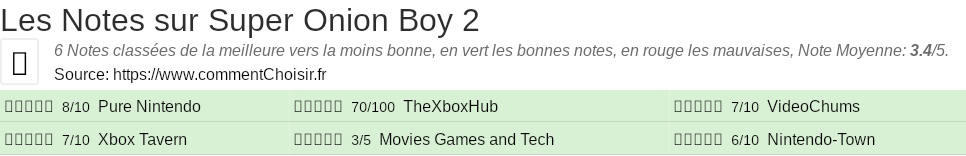 Parmis ces tests des sites & magazines internet spécialisés dans les Jeux, 6 ont donné une note et on obtient une note moyenne de 3.4/5 pour ce produit de Super Onion Boy.