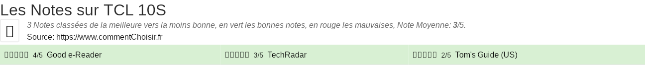 Parmis ces tests des sites & magazines internet spécialisés dans les Liseuse, 3 ont donné une note et on obtient une note moyenne de 3/5 pour ce produit de TCL .