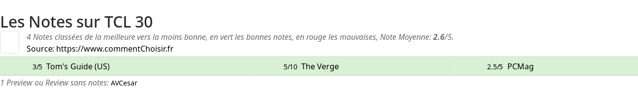 Les notes des sites et magazines internet peuvent etre peut-etre biaisés, au moins avec les avis client et des utilisateurs qui ont acheté TCL 30 sur amazon ou la fnac, on est sur d'avoir de vrais critiques sur ce produit. (les liens vers les magasins sont sponsorisés). Pour les jeux et quand cela est est possible nous listons aussi les notes moyennes sur les plateformes de consommateurs (comme IGDB)