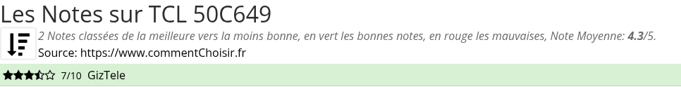 Voici tous les 2 avis et les tests que nous avons trouvé sur le Téléviseur TCL 50C649 avec les 2 notes et les commentaires des testeurs dans leur review.